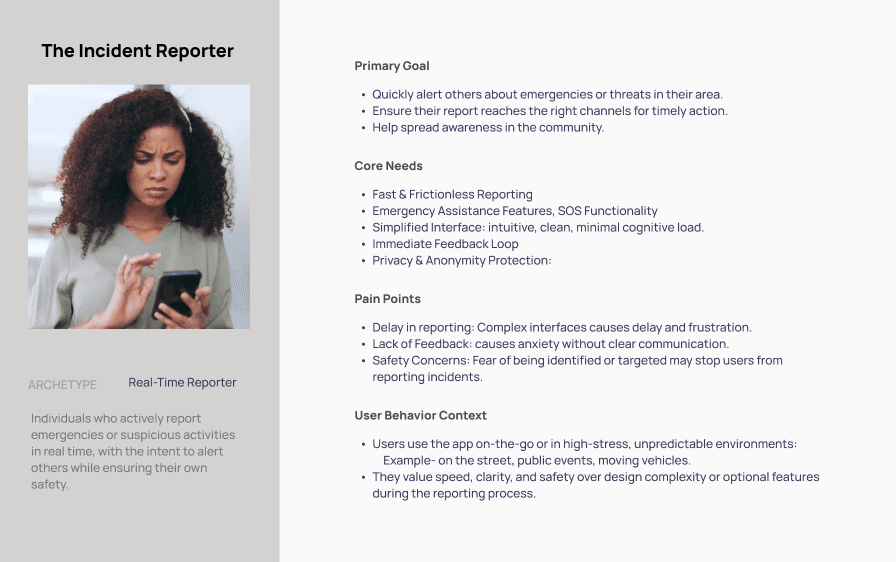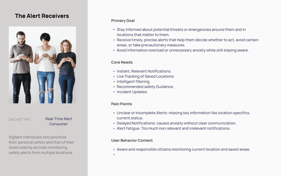 Users in the U.S, primarily individuals concerned with personal and community safety, were studied—especially those prone to panic during emergencies and key Insights were gathered.